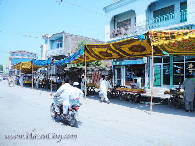 Picture was captured in front of Bank Islami, Circular Road Hazro. TMA (Town Municipal Committee) Hazro fixed some temporary stalls named “Ramazan Bazaar” for Ramazan ul Mubarak month. Fruits, Vegetables, Mutton, Chicken & Beef & other Kitchen related accessories are available here on cheap rates. These 20 Stalls will provide more then 25 Kitchen related stuff cheap as compare to Market rate.